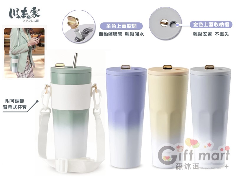 316內膽不銹鋼,真空斷熱,瓶身不冒汗燙手內膽電解處理,污垢不殘留易清洗外膽漸層色彩烤漆,流行時尚寬敞杯口清潔方便,上寬下窄杯型可放入汽車杯架800ml大容量, 飲料輕鬆外帶,環保隨手作起彈跳式吸管設計,伸縮自如可收於杯內,飲取方便附背帶/飲料杯套 方便外出攜帶,背帶可隨意調節長度上蓋自帶吸管蓋收納槽設計,有效防止掉落及遺失