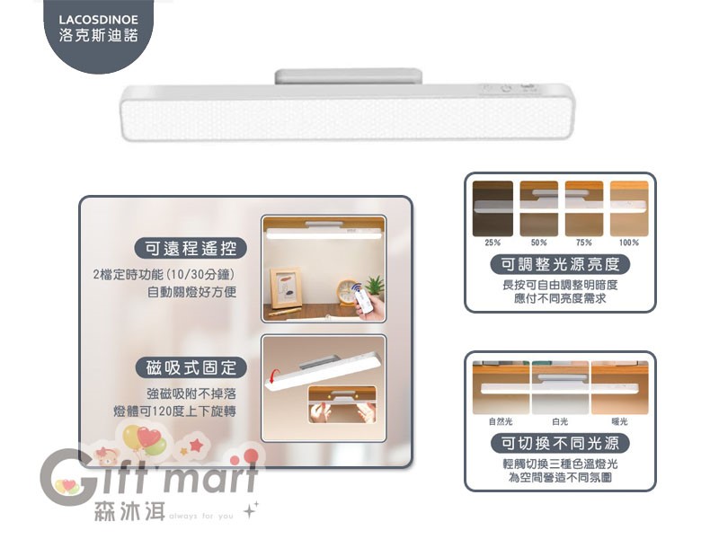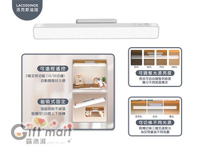 觸控開關,輕觸可切換三段光源 (白光/自然光/黃光),長按可以調整亮度內置強磁鐵,可吸附在含鐵質的物體上進行照明。附站立底座,可當手機架/手機座。磁吸/立式/手拿,可多種場景使用(宿舍、書桌、床舖、衣櫃、戶外露營等)USB充電,可使用電腦、行動電源充電附遙控器,遠程遙控,2種定時關燈。防災、停電、黑暗中的好幫手照明燈/無線燈/手電筒/檯燈/臺燈/台燈/桌燈