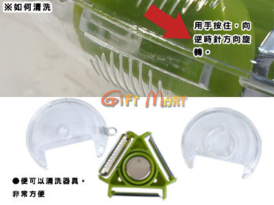 尺寸:10x9x2 cm顏色:綠色刀片功能:削皮刀x1、刨絲刀x1、削軟皮刀x1、挖坑器x1材質:食品級塑料、不鏽鋼刀片包裝:彩盒產地:台灣製造使用說明:1.本體頂部金屬輪殼,按下標記處,處於直立狀、扳動並旋轉刀架轉換角度,即可自由旋轉任何一個規格的刀片。2.使用後,如需清洗本體,只要將上下外殼旋轉打開,就可以拆卸刀架,用水沖洗或用洗碗機。