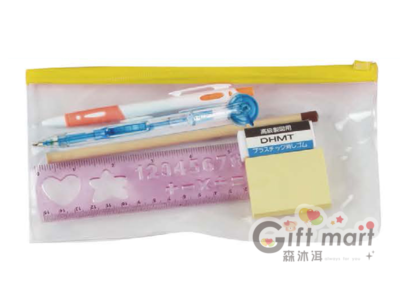 雙拉鍊三角透明筆袋+橡皮擦+2B寫不斷鉛筆+中性細字筆+15cm卡通廣告尺-文具組