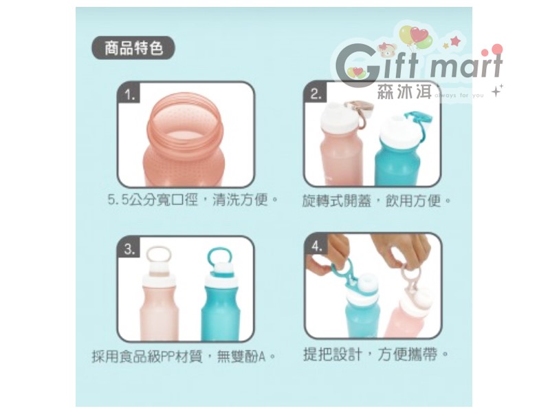 瓶身款式: 粉色、橘色材質: 聚丙烯(PP)容量: 600ml(±5%) ※另有同系列商品480ml (編號: YC966)尺寸: 直徑7.3*高20.3cm ±5%包裝: 彩盒SGS檢測通過