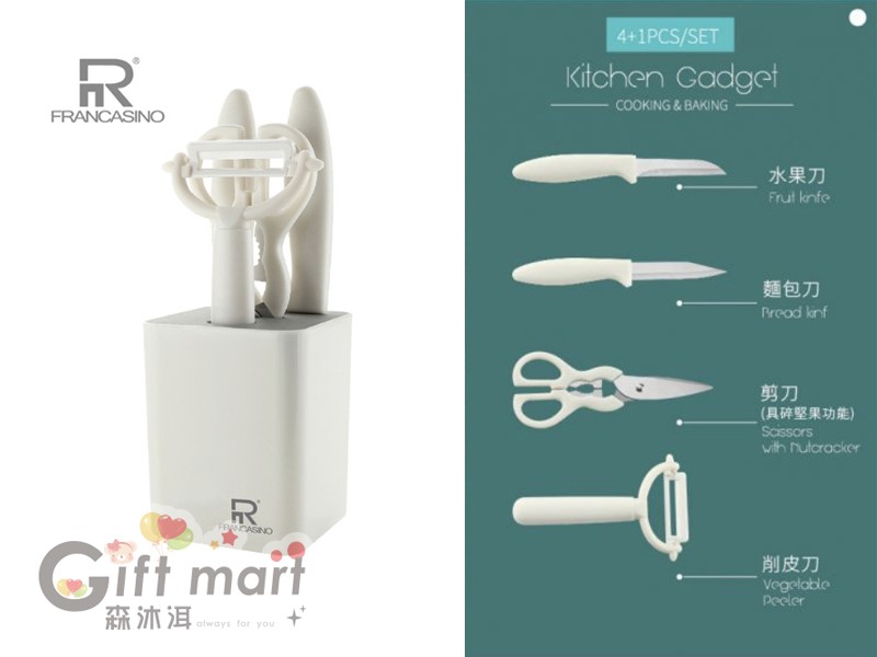 優質不銹鋼材質,持久鋒利、耐腐蝕收納座貼合插孔槽設計,不擔心刀具東倒西歪收納座底部濾網設計,防積水、灰塵刀柄,好握、好拿時尚居家生活作品,點綴生活多彩多姿好用、好清洗,廚房好幫手內容: 水果刀、麵包刀、剪刀、削皮器、收納座送禮實惠大方!廚房套組/廚房套裝/廚房用品/廚房用具