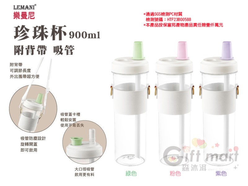 材質: 瓶身PC、上蓋PP、上蓋內矽膠圈 + 尼龍揹帶容量: 900ml ±5%尺寸: 高 約28cm、杯底直徑7.1cm (以上規格 ±5%)另可一處單色印刷LOGO 或 外包裝貼貼紙宣傳文宣