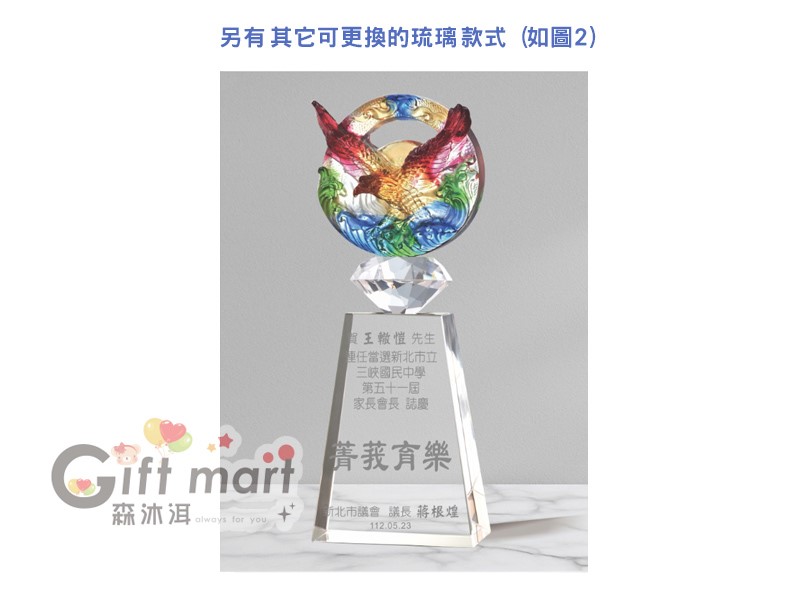 精雕細琢,品味獨特各種誌慶、紀念表揚升遷榮調、競賽獎勵饋饋佳品,訂製首選晶瑩剔透、光澤璀璨將品味融入生活,使生活充滿色彩(※琉璃在燒製過程中,顏色會自然流動,使得每一件作品的色彩、紋路和光澤都是獨一無二的。這項特色是琉璃工藝的獨特魅力,即使是同款作品,顏色也會有所差異,煩請知悉)展翅高飛/大鵬展翅/鵬飛鷹揚擺飾/競賽/紀念/琉璃水晶獎牌/水晶琉璃獎座/琉璃水晶獎座/琉璃水晶獎座/水晶琉璃系列
