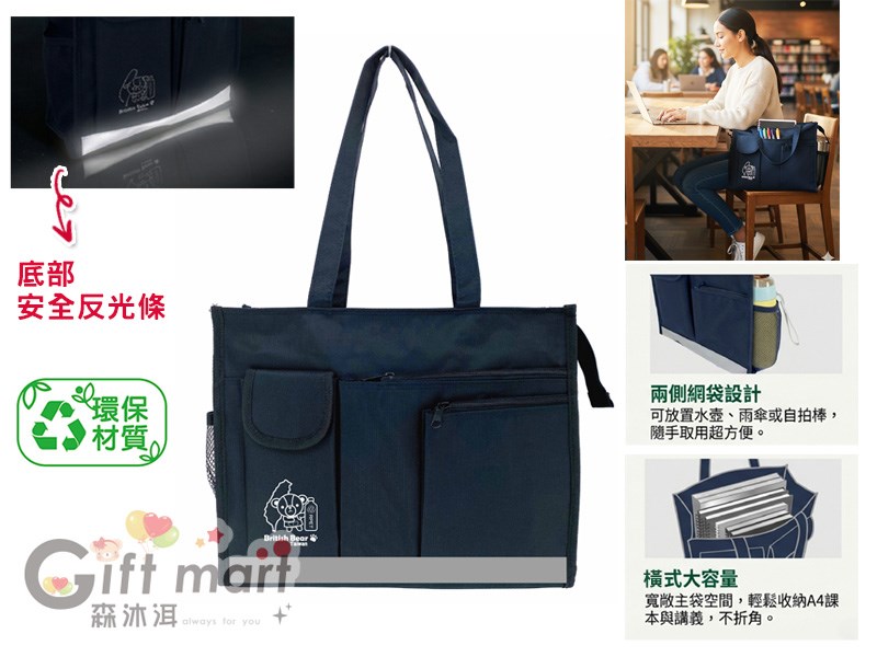 MIT台灣製造/台製PET環保紗材質(環保材質), 採用回收保特瓶製成, 環保耐用愛地球兩側網袋 可放置水瓶、雨傘或自拍棒可裝A4資料, 主袋立體寬敞, 輕鬆收納A4書本、不易折角安全反光條設計, 增加夜晚外出的安全性, 讓通勤或放學路途更安全●內零錢袋x1 ●拉鏈袋x3 ●魔鬼氈袋x1 ●側面網袋x2學生上課、補習適用資料袋/文件袋/收納袋/補習袋/側背袋/側背包