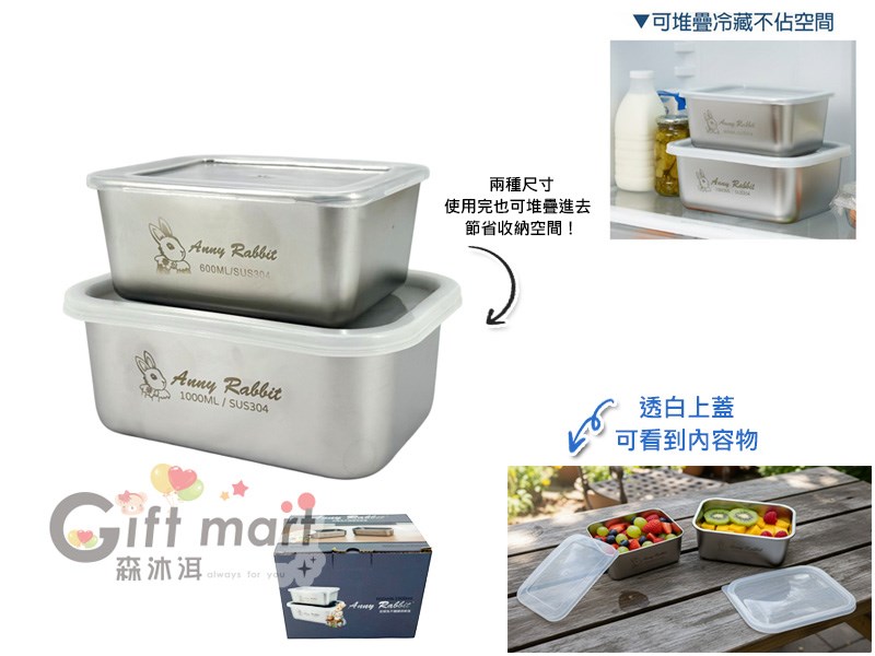 兩種尺寸保鮮盒, 可依需求選用保鮮盒使用完畢, 兩款可堆疊收納, 節省空間採用304不鏽鋼材質,清洗容易, 安全衛生, 吃得安心附蓋設計, 儲存食物超便利蓋子透白設計, 內容物可看見304不鏽鋼保鮮盒/304不鏽鋼餐盒