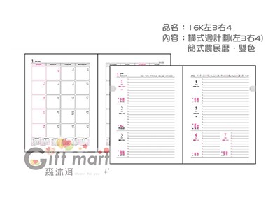 尺寸:(16K)28X21.5cm ※另有25K規格,尺寸約21x15cm(價格另計,歡迎洽詢)※活頁26孔內容:橫式週計畫(左三右四),簡式農民曆 雙色顏色:紅,藍,黑燙金範圍:12x5cm