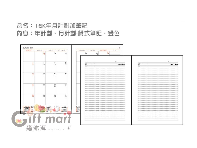 尺寸:約26x19cm ※另有25K規格,尺寸21x15cm(價格另計,歡迎洽詢)包裝:裸裝內容:年計劃,月計劃-橫式筆記版,雙色燙金範圍:12x5cm發泡皮料色彩:粉紅、粉藍、橘、黑、深藍、紅
